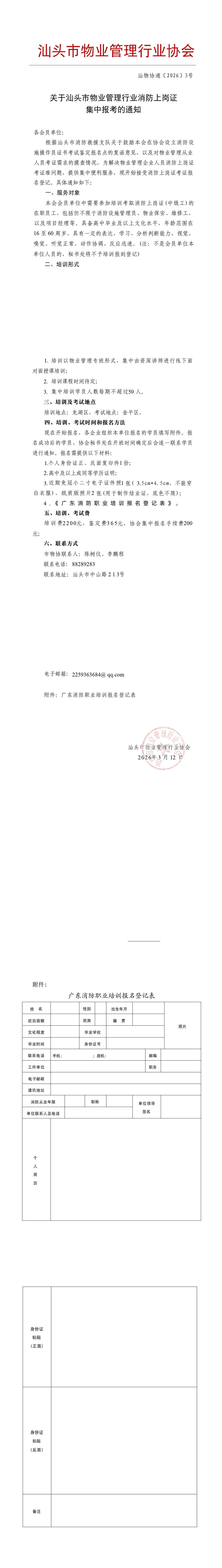 关于汕头市物业管理行业消防上岗证集中报考的通知