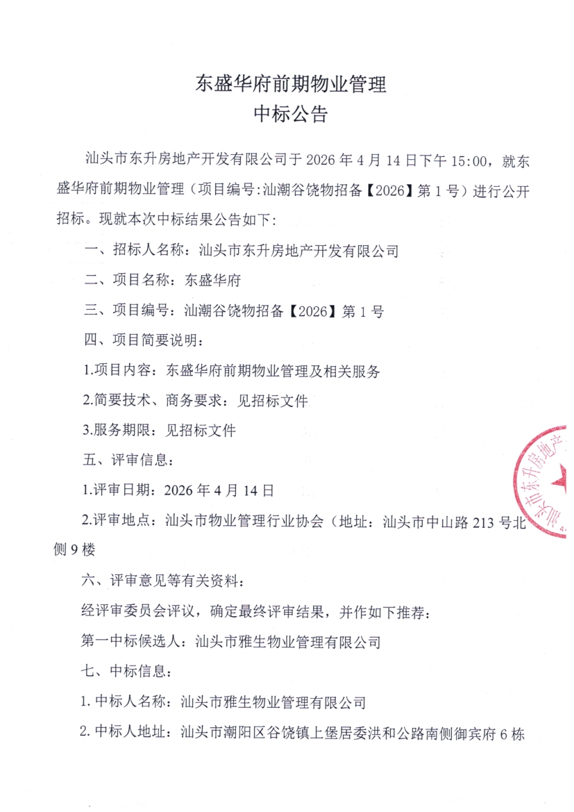 东盛华府项目前期物业管理招标中标公告