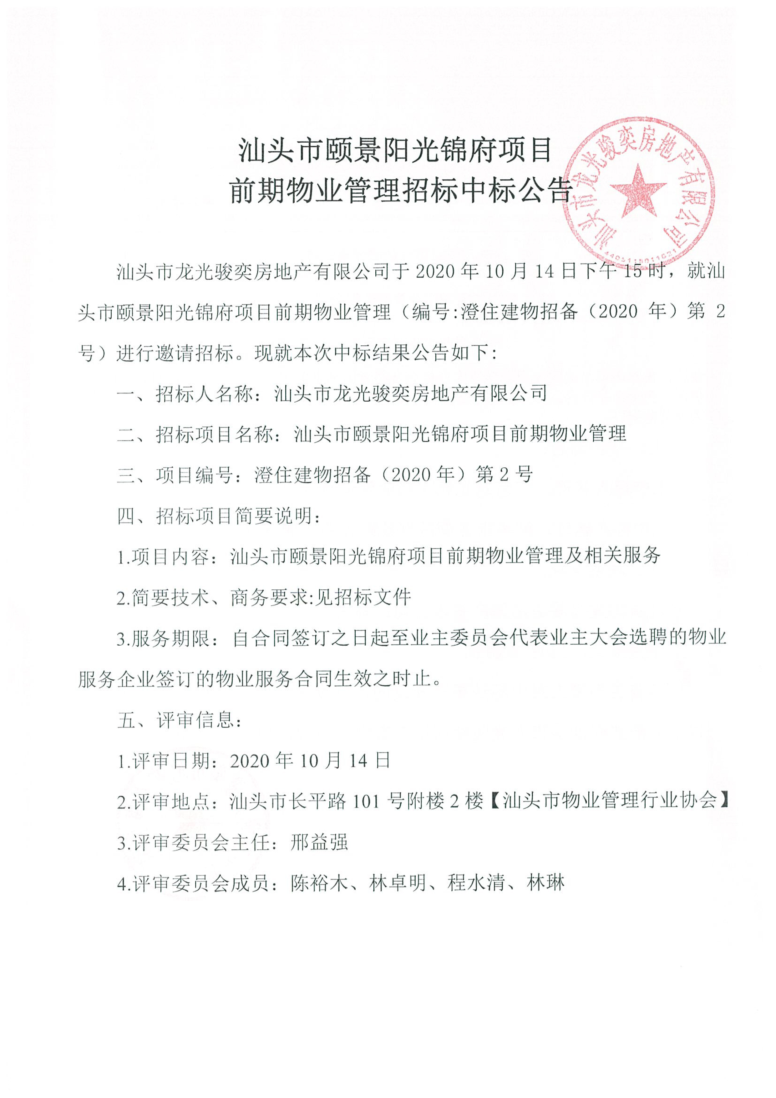 汕头市颐景阳光锦府项目前期物业管理招标中标公告