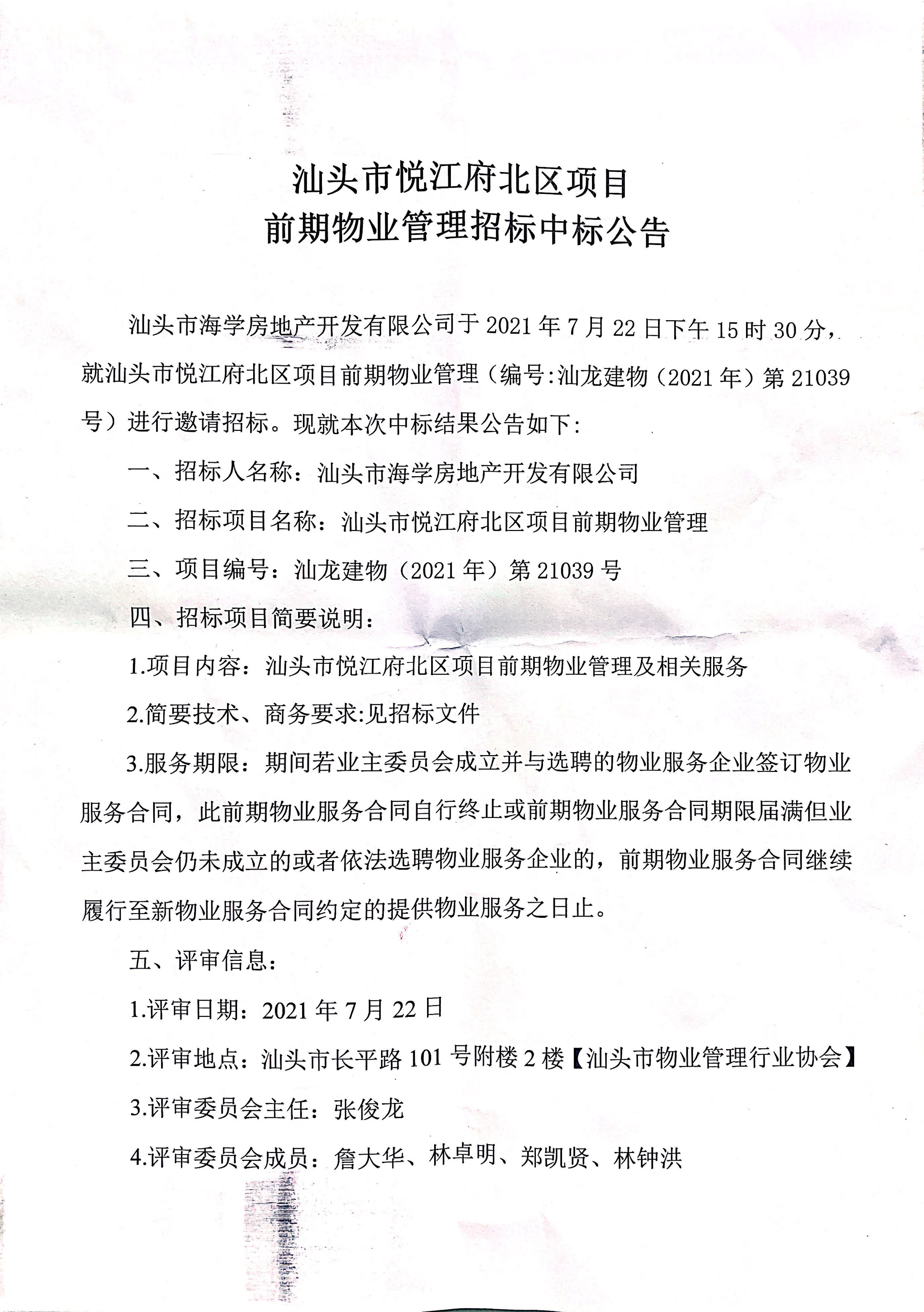 汕头市悦江府北区项目前期物业管理招标中标公告
